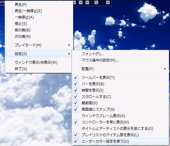 .iniファイルの[COLOR]の部分をいじって、下の画像の右クリックメニューから"ユーザーカラー設定を使う"にチェックを入れる。