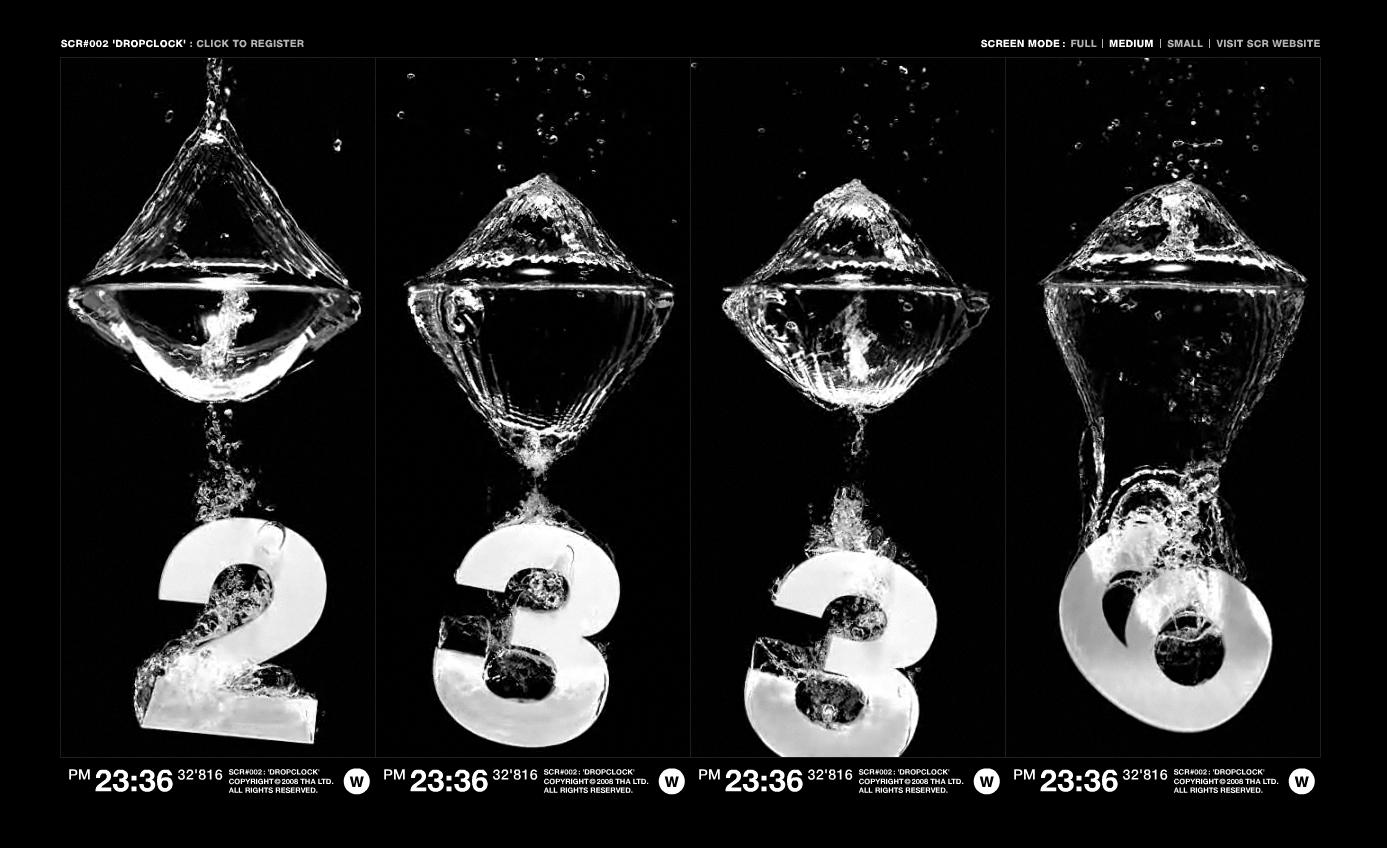 数字が水のなかに落下していく様子をスローモーションで表示するというちょっと変わったタイプの時計。単純に数字が表示されるものにくらべると若干見づらい場合があるが、悲観するほどでもなく、あとは好みの問題である。