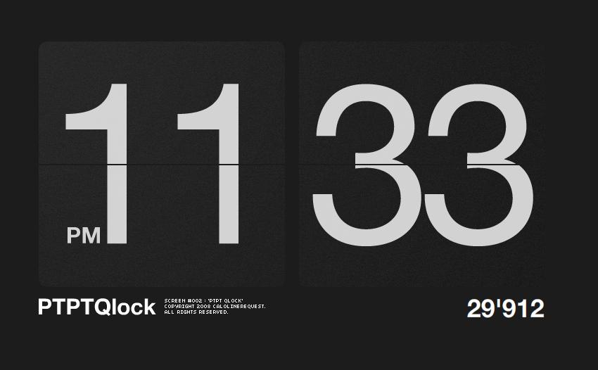冒頭に出した画像のもの。韓国のデザイナーが作成したものらしい。レトロ調な時計のスクリーンセーバー。左下に選択できる項目が3つあり、現在時間と(おそらく)起動してからの経過時間とあとひとつ。あとひとつ というのも、カウントダウンしてるのだが数字の意味がわからない。