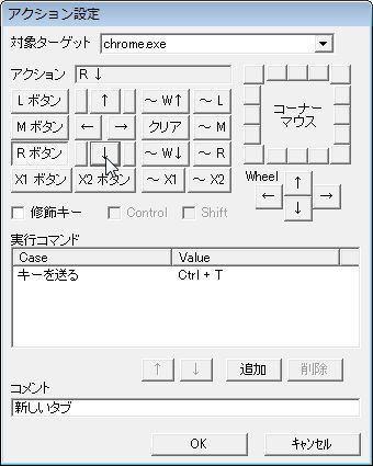 次にマウスジェスチャを設定したいターゲットを選択した状態で「Action」エリアをダブルクリックするか右側の「追加」ボタンをクリックすると下のようなウィンドウが出る。