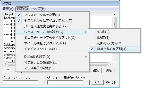 まずはマウ筋本体に関して、下のように「縦横と斜めを区別」にチェックを入れることで斜め方向のマウスジェスチャを設定することができる。