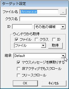 その場合にはTargetを追加するところで継承を「継承しない」にし、「マウスメッセージを横取りする」のチェックをはずして登録することで、そのアプリ上ではマウ筋によるマウスジェスチャを無効にすることができる。