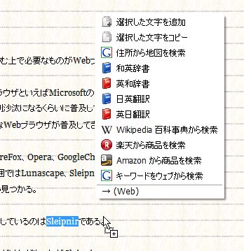 で、させたい動作のところに持っていって離せばOK。ちなみにデフォルトでは、テキトーにドラッグして離した場合は、通常使っている検索エンジンでの検索になる。てなわけで↑のように中途半端なとこで離すと、