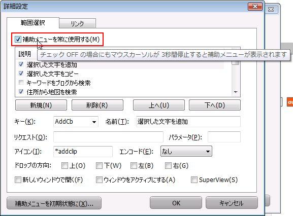さらに詳細設定で以下の部分にチェックを入れると補助メニューがすぐに表示されるようになる。